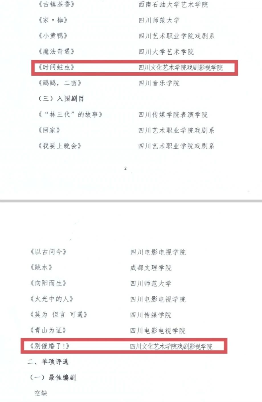 Under the meticulous guidance of their esteemed faculty members Sun Peiyuan, Xu Ge, and Zhao Shanshan, students from the Dramatic Literature and Performance programs at our university’s School of Theatre and Film have achieved remarkable success. Their original productions, titled "The Time Worms" and "Stop the Marriage Pressure!", have garnered accolades at the "Fresh Flowers in May—2025 Sichuan Provincial College Students' Environmental Theatre Exhibition". These works have been honored with the prestigious awards of "Outstanding Play" and "Shortlisted Play", respectively. This accomplishment not only highlights the exceptional talent and creativity of our students but also reflects the high-quality education and mentorship provided by our faculty.